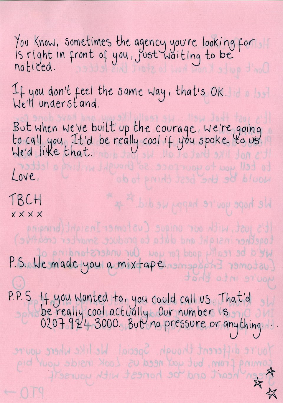 Sent to prospective clients with whom we’d had previous conversations, the love letter was designed to stand out on the post pile with its nostalgic pangs of teenage angst (and excellent stickers).