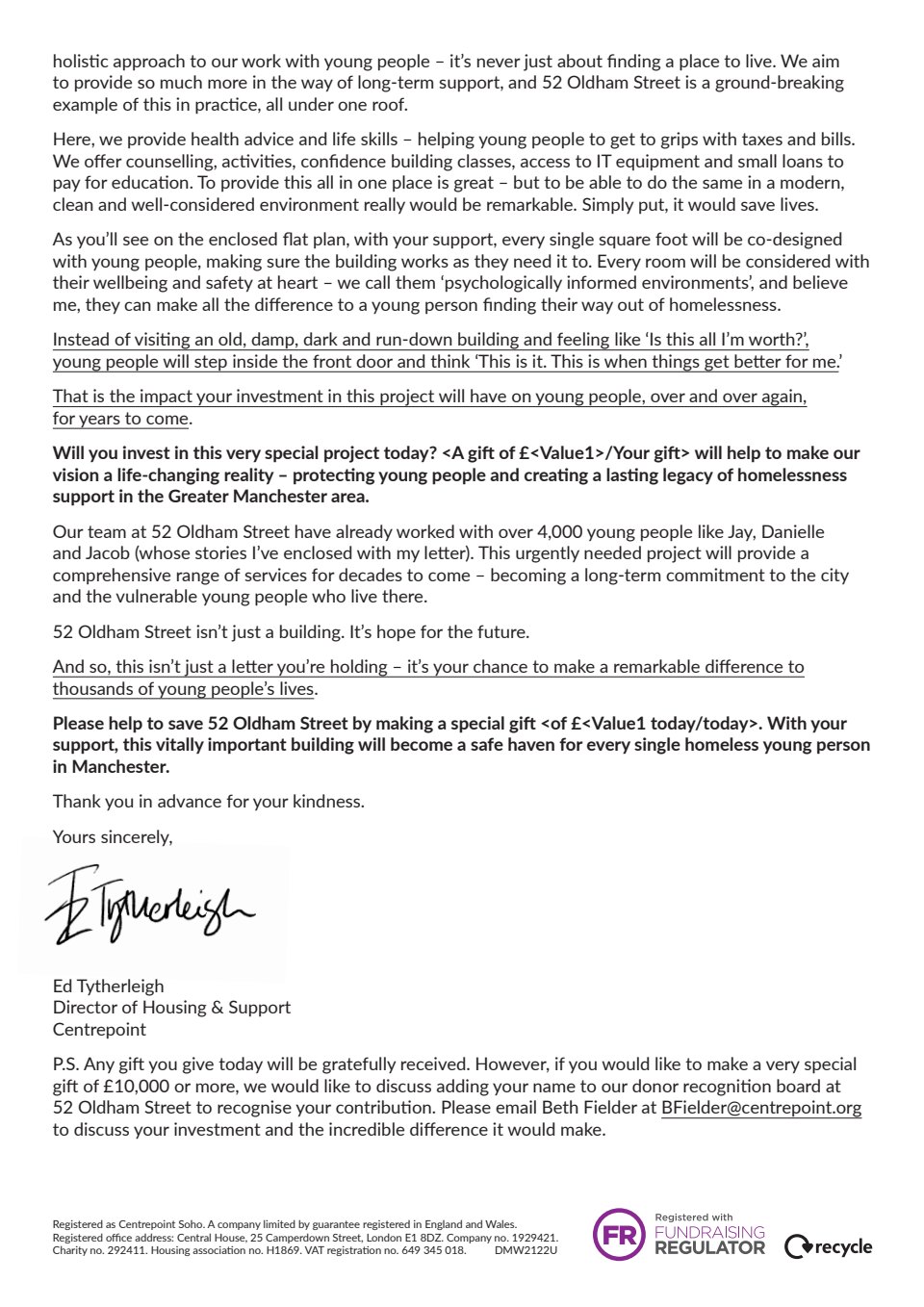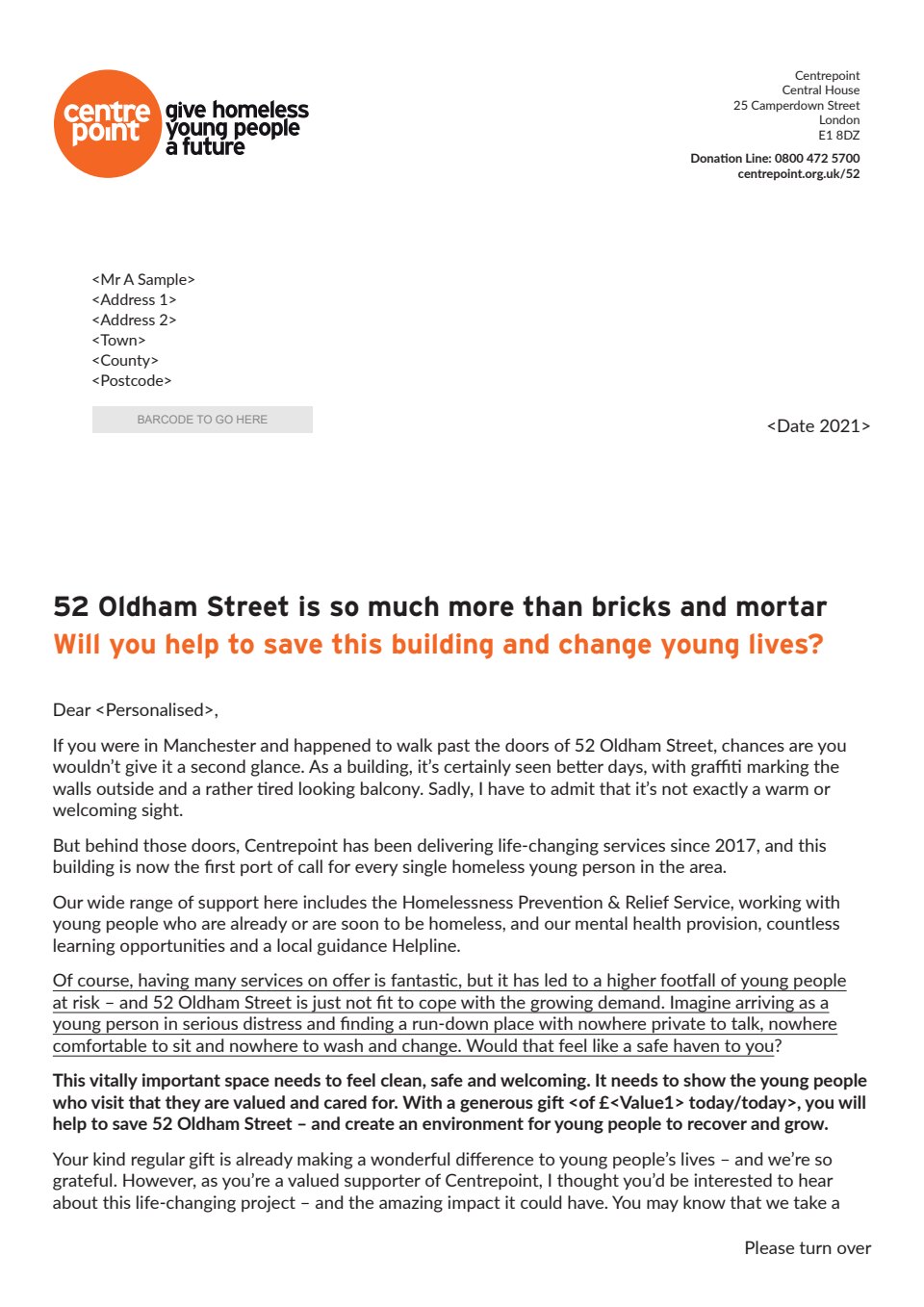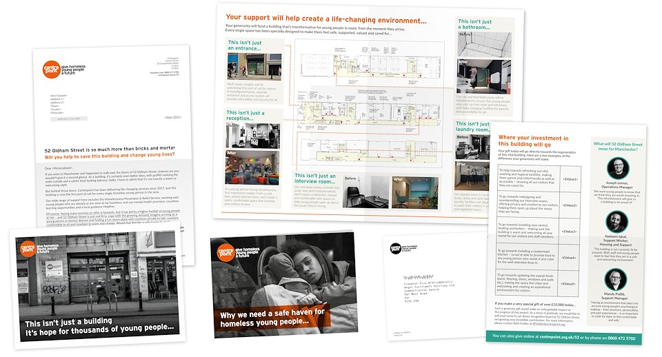We were tasked with creating a capital appeal to target Centrepoint’s mid-value donors, asking them to make a donation to fund the refurbishment. We chose to focus in on each area of the building and show how it could uniquely benefit the young people who visit, bringing our asks to life and making them super tangible.